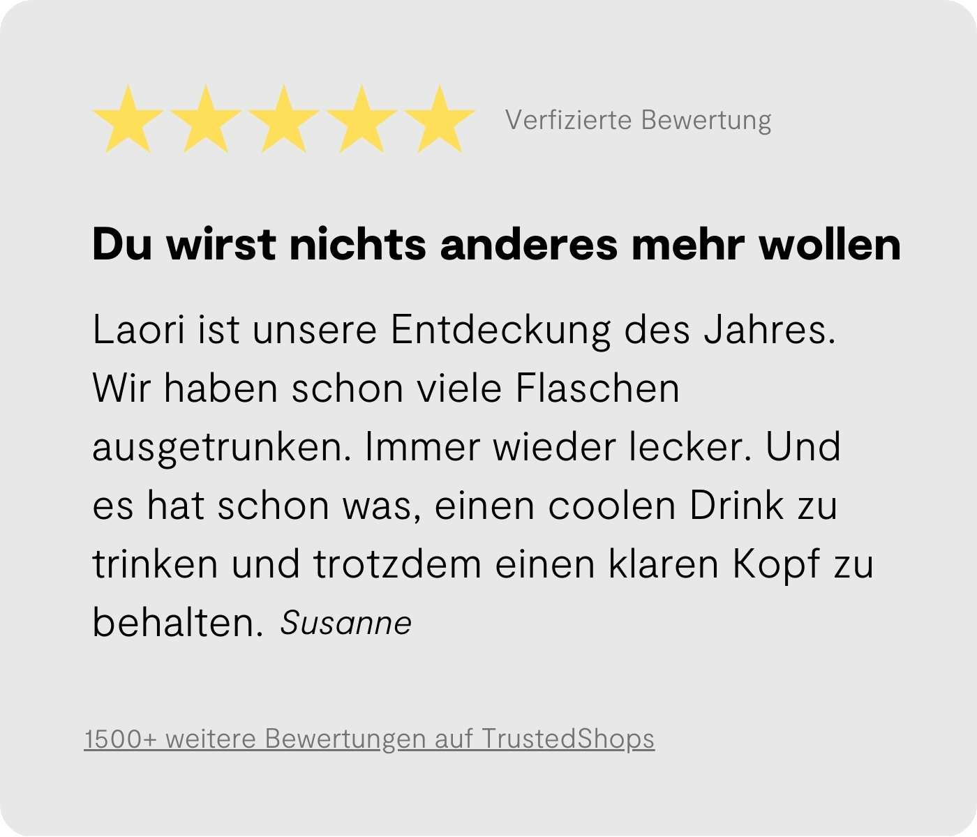 Laori contains less than 0.3 percent residual alcohol by volume. Laori is only consumed mixed in a drink. Therefore, the alcohol content is significantly reduced. A Laori & Tonic contains only 0.06 percent alcohol by volume. That's less than the alcohol content in a glass of apple juice, where up to 0.3 percent is permitted. In grape juice, even up to 1.2 percent. %. Incidentally, 0.0 % products contain up to 0.03% alcohol. Therefore, completely avoiding alcohol is a real challenge. You can learn more in the magazine.