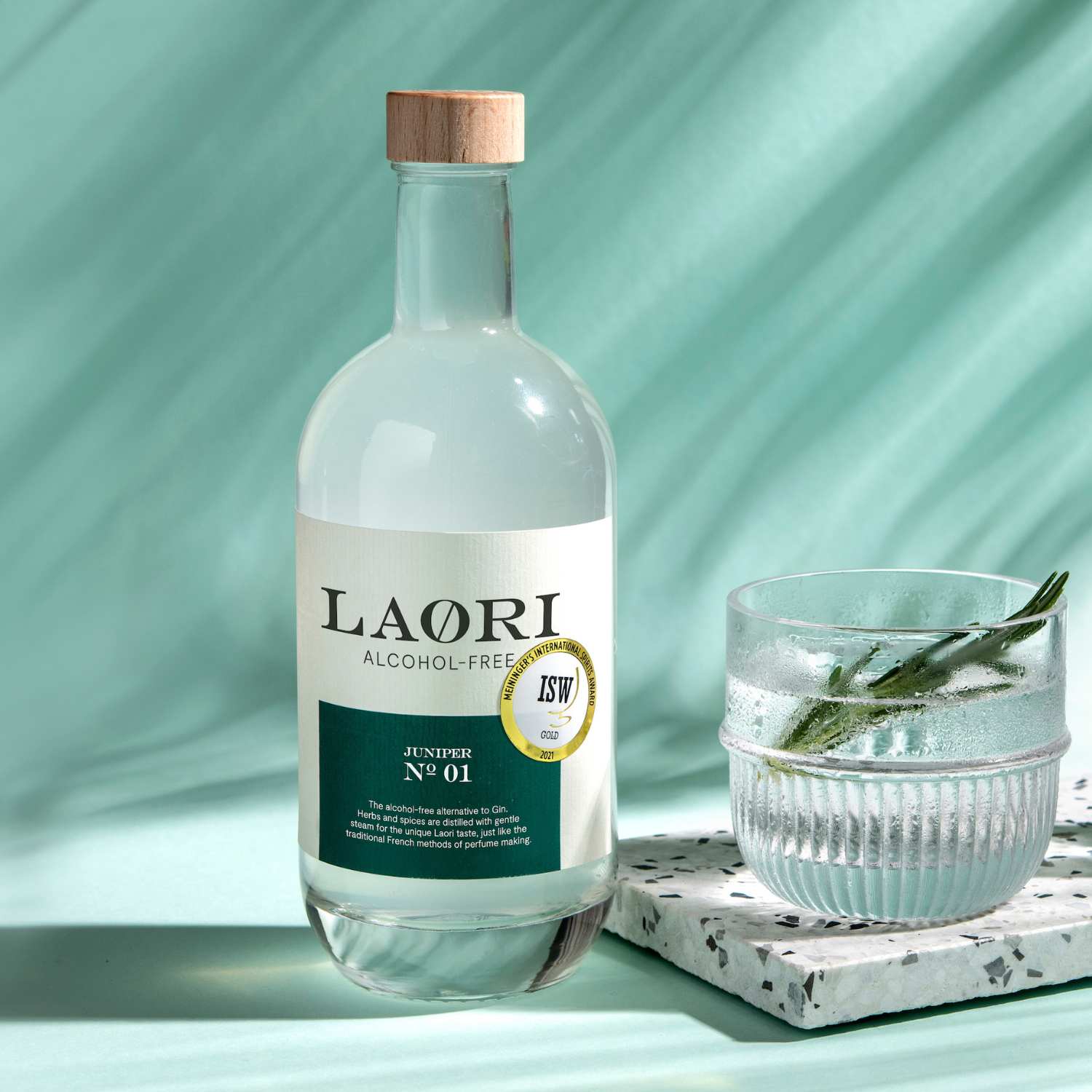 A new manufacturing process was specially developed for Laori Juniper No. 1, derived from French perfume distillation. It naturally recreates the aroma and taste of gin. Eight select botanicals, such as juniper, cardamom, and rosemary, are gently steam distilled. The result is a taste that makes you forget that Laori No. 1 is alcohol-free.